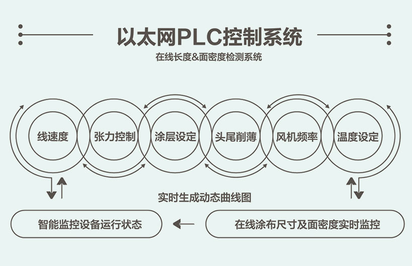 涂布工序采用西門子以太網(wǎng)PLC控制系統(tǒng),采用總線控制模式,提高數(shù)據(jù)傳輸速度,智能化配置“在線長度監(jiān)測系統(tǒng)”、“在線面密度檢測系統(tǒng)”在線涂布尺寸及面密度實時監(jiān)控,生成實時動態(tài)曲線圖。涂布線速度、張力控制、涂層設(shè)定、頭尾削薄設(shè)定、風(fēng)機(jī)頻率、溫度設(shè)定,均可通過觸摸屏設(shè)定、顯示并記錄。生產(chǎn)過程中智能監(jiān)控設(shè)備運行狀態(tài),過程數(shù)據(jù)自動保存并評估設(shè)備運行是否異常并提示。智能評估提前預(yù)警各關(guān)鍵部件壽命管控,并具備遠(yuǎn)程操作和維護(hù)。